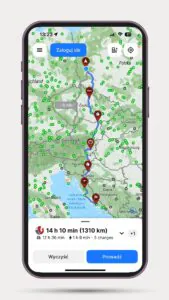 - 🇭🇷 Split (Chorwacja) – 1310 km 🔋 5 ładowań ⏱️ 1h 9 min 💰 ok. 1100 zł